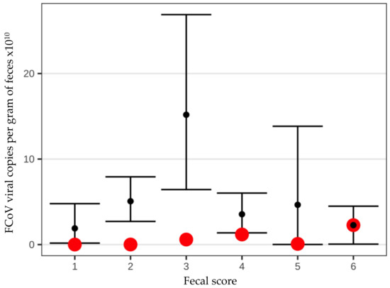 Bootstraps demonstrating no correlation between fecal score and fecal feline coronavirus (FCoV) load in viral copies per gram (g) of feces. Black points represent the mean fecal FCoV load in viral copies per g of feces. The 95% confidence intervals for the mean were calculated via the basic nonparametric bootstrap without assuming normality. Red points represent the median fecal FCoV load in viral copies per g of feces.
