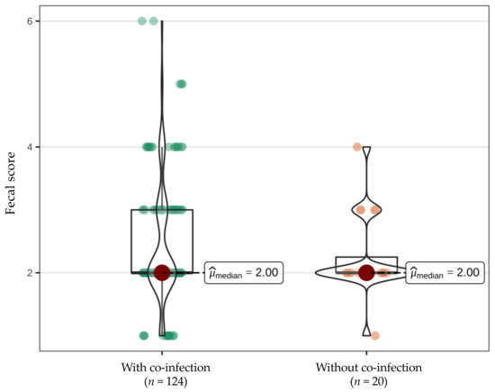 Box-Violin plots with medians (red points) display the non-normally distributed nature of the fecal score and demonstrate that there is no difference in fecal score between cats with feline coronavirus (FCoV) infection with or without co-infection with other potential enteropathogens (p = 0.455) according to the nonparametric Mann–Whitney U test.