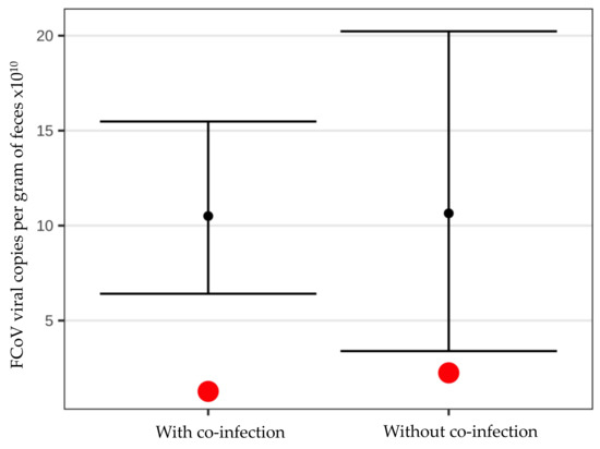 Bootstraps demonstrating the difference in fecal feline coronavirus (FCoV) load in viral copies per gram (g) of feces between FCoV-infected cats with and without co-infection with other potential enteropathogens. Black points represent the mean fecal FCoV load in viral copies per g of feces. Red points represent the median fecal FCoV load in viral copies per g of feces.