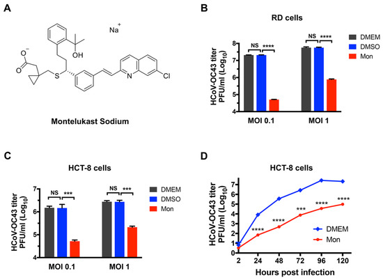 The molecular structure of montelukast (Mon) and its inhibitory activity against HCoV-OC43 in RD and HCT-8 cells. (A) The molecular structure of montelukast. (B) Montelukast inhibited the infection of HCoV-OC43 in RD cells at a multiplicity of infection (MOI) of 0.1 and 1. (C) Montelukast inhibited the infection of HCoV-OC43 in HCT-8 cells at MOI 0.1 and 1. (D) Inhibition of montelukast against HCoV-OC43 in multi-cycle replication assay. Data are represented as means ± SD. NS, not significant; *** p < 0.001; **** p < 0.0001.