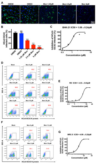 Inhibitory activity of montelukast (Mon) against HCoV-OC43 infection in a dose-dependent manner. Antiviral activity of montelukast against HCoV-OC43 in BHK-21 cells were measured by immunofluorescence assay (A,B) and in plaque reduction assay (C). HCoV-OC43 N protein were stained by the mouse anti-HCoV-OC43 nucleoprotein mAb (green); nuclei were stained by 4,6-diamidino-2-phenylindole (blue), scale bar: 25 µm. RD cells were infected by HCoV-OC43 with serially diluted montelukast, then the percentage of infected cells (red numbers) was evaluated by flow cytometry and the 50% inhibitory concentration (IC50) value was calculated (D,E). MRC-5 cells were infected by HCoV-OC43 with serially diluted montelukast, the percentage of infected cells (red numbers) was evaluated by flow cytometry, and the IC50 value was calculated (F,G). Data are represented as means ± SD. NS, not significant; *** p < 0.001; **** p < 0.0001.