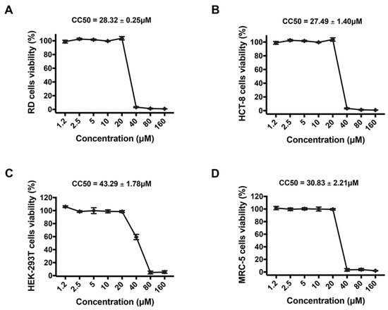 In order to further verify that the potent inhibitory activity of montelukast against HCoV-OC43 infection is independent of its cytotoxicity, the viability of RD cells, HCT-8 cells, MRC-5 cells, and HEK-293T cells treated with montelukast ranging from 1.2 to 160 µM for 2 days were analyzed by CCK-8. As shown in Figure 3, montelukast did not affect the viability of the tested cells at the concentration of 20 µM or lower. All of the results demonstrated that montelukast exhibited potent antiviral activity against HCoV-OC43 infection at these concentrations without cytotoxicity in different host cells.