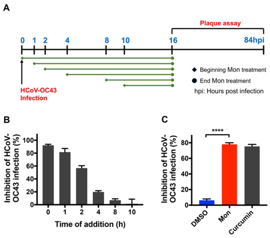 Montelukast (Mon) inhibited HCoV-OC43 infection through blockage of the early stage of the virus lifecycle. (A) Outline of time-of-addition experiment. hpi: hours post infection. (B) Time-of-addition experiment to study montelukast against HCoV-OC43 infection. Montelukast was administrated at different time point after infection and plaque assay was performed to evaluate antiviral activity of the drug. (C) Montelukast blocked HCoV-OC43 attachment to BHK-21 cells. The mixture of virus and montelukast was added to BHK-21 cells monolayer and incubated on ice for 1 h. Then, montelukast and the unbound virions were removed by washing. Curcumin was included as positive control. Data are presented as means ± SD. **** p < 0.0001.