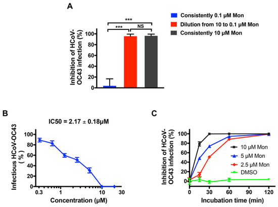 Montelukast (Mon) directly inactivated HCoV-OC43 particles in an irreversible and time-dependent manner. (A) Antiviral activity of montelukast against HCoV-OC43 was irreversible. The viruses were incubated with montelukast (10 µM) for 1 h, and then the mixture was diluted by 100-fold, resulting in decrease of the concentration of montelukast to 0.1 µM before performing plaque assay. (B) HCoV-OC43 virions were treated with serially diluted montelukast for 2 h at 33 °C. Then, viruses were precipitated and separated from montelukast by PEG-8000 and the plaque assay was performed to detect HCoV-OC43 infectivity. (C) Montelukast inhibited HCoV-OC43 infection in a time-dependent manner. HCoV-OC43 was treated with montelukast (2.5, 5, and 10 µM) for different times at 33 °C, and then plaque assay was performed to detect HCoV-OC43 infectivity. Data are presented as means ± SD. NS, not significant; *** p < 0.001.