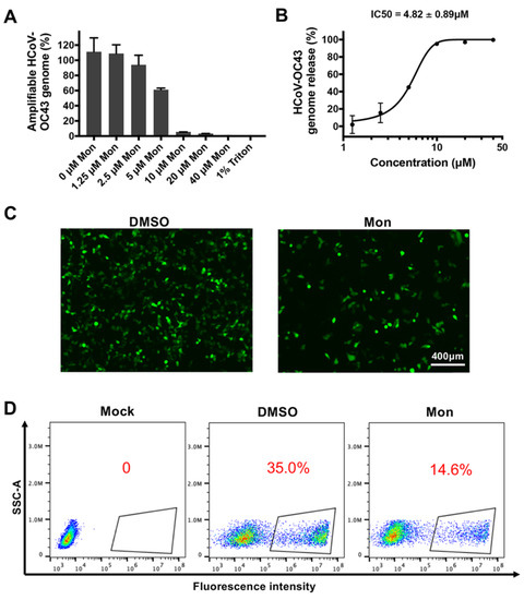 Montelukast (Mon) induced release of HCoV-OC43 genomic RNA by disrupting the integrity of the virions. (A). RNase digestion experiment was used to detect the genomic RNA unreleased by HCoV-OC43 treated with montelukast. The genomic RNA coding HCoV-OC43 nucleoprotein was detected. (B) The IC50 value of montelukast on release of HCoV-OC43 genomic RNA. (C) Montelukast affected the efficiency of transfection based on Lipoectamine 2000. The mixture of montelukast, EGFP plasmid, and Lipoectamine 2000 was incubated for 40 min at room temperature, and then added to the HEK-293T cell monolayer. Twenty-four hours after transfection, fluorescence microscopy and flow cytometry analysis detected the efficiency of transfection (D), scale bar: 400 µm; red numbers: the percentage of cells expressing EGFP. Data are presented as means ± SD.
