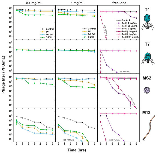 The realistic concentrations of Fe2+ and Fe3+ ions did not affect the studied phages within 6 h of incubation (Figure 2). Higher concentrations of Fe2+ and Fe3+ ions were taken as controls to analyze their impact on phages, if any. We found that 1 mg/mL of Fe2+ and Fe3+ ions caused complete removal of T7, MS2, and M13 within 6 h. Fe3+ fully removed T4, but the titer was only slightly affected by Fe2+ ions. The action of Fe3+ against T4, M13, and T7 is much quicker (T7 removed after around 30 s of exposure) than MS2.