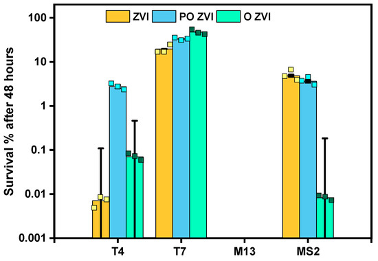 Next, phages were incubated with all three forms of ZVI for 48 h. ZVI did not change its color even after the experiment, as it was kept in an inert atmosphere. The percentages of survived phages (normalized by the initial concentration of each phage sample) are shown in Figure 3.