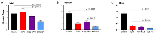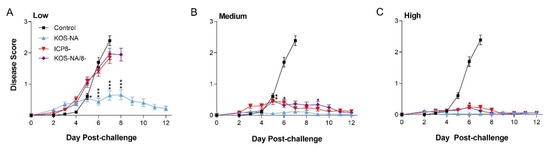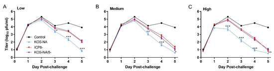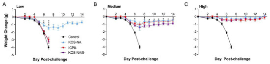 Body weight of the mice was determined for 2 weeks post-challenge as a sensitive indicator of general health. At the low vaccine dose, only KOS-NA reduced weight loss post-challenge (Figure 4A). Mice immunized with the medium dose of any vaccine experienced little change in body weight compared with the control mice, although interestingly, mice immunized with KOS-NA/8- were slightly less protected than KOS-NA (Figure 4B). All vaccines given at the high dosage completely protected mice from weight loss (Figure 4C).