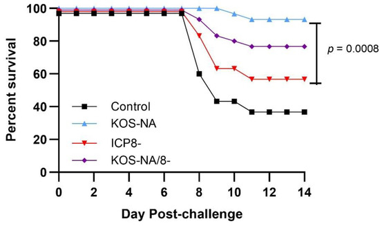 Survival of vaccinated mice after virus challenge. Mice were vaccinated with supernatant (control) or a low (2 × 104 pfu/eye) dose of KOS-NA, ICP8-, and KOS-NA/8-. At 30 days post-vaccination, mice were challenged with HSV-1 strain mP (4 × 105 pfu/eye) by corneal infection, and their survival was observed up to 14 days post-challenge. Data shown are survival ± SEM from 3 independent experiments. Survival of KOS-NA-vaccinated mice was statistically different from ICP8- by the log-rank test.