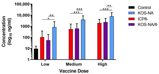 Titers of HSV-specific antibody in immunized mice. Groups of 10 BALB/c mice were immunized with low (2 × 104 pfu), medium (1 × 105 pfu), or high (5 × 105 pfu) doses of the indicated viruses, and 1 group of mice was immunized with supernatant (control) as a negative control. Blood was collected 21 days post-immunization, and HSV-specific serum IgG was quantified by ELISA. Data represent the geometric mean titer for each group ± SEM and are the combined results of 3 independent experiments for n = 30 mice per group. *** p < 0.0004, ** p = 0.0011–0.0055, and * p = 0.011 indicate significant differences for KOS-NA compared to ICP8- and KOS-NA/8- viruses using one way ANOVA.
