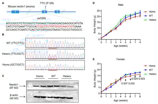 Characterization of nectin1 (F129A) mutant mice. (A) Gene targeting strategy to introduce F129A mutation in mouse nectin1. Sequences in red letters are gRNA-recognized target harboring F129A mutation (underlined sequences). (B) Sequences of nectin1 mutation site in homozygous, heterozygous, and WT mice. The underlined sequences are F129 mutation sites. (C) Nectin1 expression status in brain tissues of homozygous, heterozygous, and WT mice. (D,E) Growth curves of male (D) and female (E) F129A mutant mice. Female homozygous mutant mice had significantly reduced body weight compared with WT littermates at five, six, seven, and eight weeks. Data are presented in mean ± standard deviation. p-values represent homozygous versus WT and were analyzed with one-way ANOVA followed by Dunnett’s multiple comparison test. ssODN, single-stranded oligodeoxynucleotides; Homo, homozygous nectin1 (F129A) mutant mice; Hetero, heterozygous nectin1 (F129A) mutant mice; WT, wild-type mice.