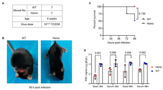We conducted two viral challenge experiments to test the PRV infection status in the mutant mice. Prior to experiments, we evaluated the susceptibility of the mouse strain we used (C57BL/6) to PRV. Our pre-experiments showed that the attenuated PRV vaccine strain Bartha-K61 was mildly pathogenic to C57BL/6 mice, but a field-isolated highly virulent strain of PRV [22] can cause acute symptoms with a high mortality in 3–10 days after viral inoculation in different doses. Infected mice showed viremia and tissue lesion, and high viral load in infected tissues can be detected by qPCR (data not shown). The susceptibility of C57BL/6 mice to PRV has also been comprehensively investigated in previous reports [27,28,29]. Upon confirming the PRV susceptibility of mice, we performed experiment 1, in which seven WT and seven homozygous at six weeks were given subcutaneous injection with 1 × 105.43 TCID50 PRV field strain (Figure 2A). After PRV inoculation, three mice of each genotype were sacrificed to collected tissues and serum to detect tissue morphology and viral loads at 36 h. The four other mice in each group were maintained to observe disease development for 96 h. Among them, two WT mice had symptoms of scratching and body incoordination starting at 48 h after inoculation and died at 72 h and 96 h, respectively (Figure 2B,C and Figure S2). All WT mice displayed acute itch symptom during the challenge period, but only two homozygous mutant mice had slight symptom starting at 84 h (Figure S2). qPCR results showed that viral copies in brain and serum of homozygous mice were lower than WT (Figure 2D).