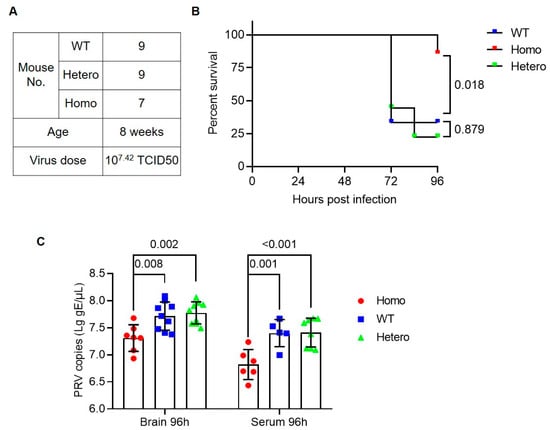 We further repeated viral challenge experiment (experiment 2) by using a high dose of virus and including heterozygous mice as subjects. A total of nine WT, nine heterozygous, and seven homozygous at the age of eight weeks were subcutaneously injected with 1 × 107.42 TCID50 PRV field strain (Figure 3A). Follow-up observations showed that six WT and seven heterozygous mice displayed neurological symptoms, such as scratching and biting, starting from 36 h, and finally died within 96 h. In the homozygous group, one showed neurological symptoms at 72 h and died at 96 h; three had slight scratching behavior at 96 h (Figure 3B and Figure S3). All infected mice were sacrificed at 96 h for serum and tissue sampling. Viral DNA extracted from half brain and serum in the same amount showed a significantly reduced viral copies in homozygous mice compared with WT and heterozygous. The viral copies in serum and brain between WT and heterozygous were not different significantly (Figure 3C).