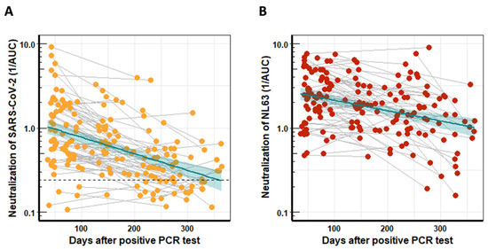 Most people have preexisting immune responses against the huCoVs that cause common colds [14,17,18]; hence, we also studied the longitudinal NL63-neutralization potential in serum from COVID-19 patients. Neutralization activity was determined with lentiviral vectors pseudotyped with the NL63 spike protein and is represented as the reciprocal AUC (Figure 1B). The neutralization activity of patient-derived antibodies was again quite diverse. Interestingly, the NL63 neutralization activity decreased significantly (p < 0.0005) over time with a half-life of 218 days, slightly longer than that for SARS-CoV-2. Background levels could not be determined, as, due to the high seroprevalence, NL63 negative serum was not available.