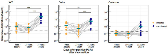 A subgroup of recovered COVID-19 patients who had provided blood samples after vaccination with the mRNA vaccine Comirnaty was available. Serum from these individuals was first analyzed for neutralization activity against SARS-CoV-2 WT, Delta, and Omicron. The serum samples were divided into three groups, early after infection (52 ± 6 days), late after infection (274 ± 22 days), and after vaccination (35 ± 10 days). The neutralizing activity against SARS-CoV-2 WT and Delta waned over time, as shown above. However, vaccination increased the neutralization activity 31.5-fold against WT and 11.1-fold against Delta compared to the titer early after the infection (Figure 2). Overall, the neutralization values for Delta and WT were almost identical at early and late time points after infection, with mean reciprocal AUCs of 1.33 and 0.51 for Delta and 1.13 and 0.67 for WT, and were significantly different (p < 0.005) only after vaccination with mean AUC values of 5.27 for Delta and 22.06 for WT.