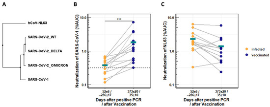 Longitudinal neutralization activity from serum of COVID-19 patients against distantly related CoVs. (A) Neighbor-joining tree based on receptor binding domains (RBDs) of different coronaviruses. (B) Neutralization activity of COVID-19 convalescent serum against SARS-CoV-1 before and after Comirnaty vaccination. (C) Neutralization activity of COVID-19 convalescents serum against NL63 before and after Comirnaty vaccination. Serum neutralization was determined with pseudotyped lentiviral vector particles. Asterisks indicate significance levels: (***) for a p-value ≤ 0.001, and turquoise bars denote respective mean values.
