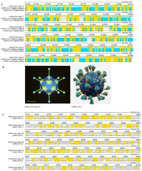 (A) SARS-CoV-2 original Wuhan and delta spike sequences versus fiber protein of human adenovirus type 2 (Ad2). Segmental homology 45.1%. (B) Viral models of human adenovirus type 2 and SARS-CoV-2. (C) Sequence alignment between Wuhan SARS-CoV-2 and adenovirus type 12 (Ad12). The yellow highlight designates sequence identities between the genomes of SARS-CoV-2 and Ad2 (A) or Ad12 (C). The blue highlight stands for sequence identities between the nucleotide sequences of the SARS-CoV-2 spike in the WUHAN isolate and its delta variant.