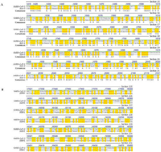 (A) Sequence alignment between Wuhan SARS-CoV-2 and HIV-1. (B) Sequence alignment between Wuhan SARS-CoV-2 and Sulfolobus turreted icosahedral virus 1 (STIV1). The yellow highlight designates sequence identities between the genomes of SARS-CoV-2 and HIV (A) and Sulfolobus turreted icosahedral virus (STIV1) (B), respectively.