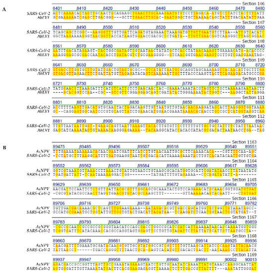 (A) Sequence alignment between the genomes of Wuhan SARS-CoV-2 and of Alternaria brassicicola endornavirus (AbEV1). (B) Sequence alignment between the genomes of Wuhan SARS-CoV-2 and of Autographa californica nuclear Polyhedrosis Virus (AcNPV). The yellow highlight designates sequence identities between the genome of Alternaria brassicola endornavirus (AbEV1) (A), or Autographa californica Nuclear Polyhedrosis Virus (AcNPV) (B) with the genome of SARS-CoV-2.