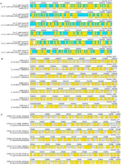 (A) Sequence alignment between Wuhan SARS-CoV-2 and Candidatus Carsonella ruddii. (B) Sequence alignment between Wuhan SARS-CoV-2 and E. coli K12. (C) Sequence alignment between Wuhan SARS-CoV-2 and human mitochondrial DNA. The yellow highlight designates sequence identities between the genomes of SARS-CoV-2 and two segments of the proteobacterium Candidatus Carsonella ruddii (A), a segment of the Escherichia coli K12 genome (B) or mitochondrial DNA of Homo sapiens (C). The blue highlight stands for sequence identities between the nucleotide sequences of two different segments of the Candidatus Carsonella ruddii genome.