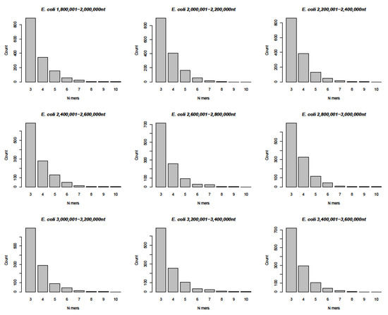 The comparison between the 29,903 nucleotide sequence of SARS-CoV-2 and the entire Escherichia coli K12 nucleotide sequence of 4,641,652 nucleotide pairs produced a statistically very rigorous insight into nucleotide sequence relationships. The data in Figure 5 and Figure S5A,B (Supplemental Materials) confirm the occurrence of n = 3-mers to n = 10-mers, as described above, for many different sets of sequences but fail to reflect the actual complexities of the micro-modular arrays (as apparent from the sequence alignments in Figure 1, Figure 2, Figure 3 and Figure 4).