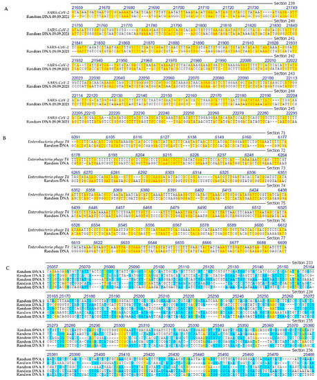 (A) Sequence alignment between Wuhan SARS-CoV-2 and a randomly computer-generated DNA. (B) Sequence alignment between bacteriophage T4 and a randomly computer-generated DNA. (C) Sequence alignments between five randomly computer-generated DNAs. The different highlights have been explained in the legends of Figure 1, Figure 2, Figure 3 and Figure 4. The blue highlights in part (C) indicate sequence identities among different randomized sequences.