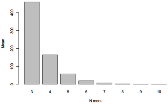 This series of random sequence controls was expanded in two ways. First, the randomization was now based on the 29.903 nucleotide length and additionally on the specific nucleoside composition of the SARS-CoV-2 RNA molecule. Second, a total of 1000 such randomized sequences were analyzed by the program described in Section 2. Figure 8 documents that the frequency distributions of 3- to 9- (10-)-mers of sequence identities among 1000 randomized A, C, G, T sequences followed the same patterns very closely as shown in Figure 5A–K and Figure 6 for comparisons between the SARS-CoV-2 and the analyzed nucleotide sequences in this report. Hence, the data further support the notion that platforms of annealable nucleotide sequences can be attributed to the inherent characteristics of the four letter code that generated all of biology.