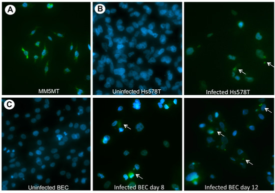Dark field microscopy showing betaretrovirus RNA by in situ hybridization (green signal) (A) MMTV RNA in the MM5MT murine breast cancer cells (control), (B) HBRV in the cytoplasm of Hs578T following co-culture with PBC conditioned media and (C) HBRV signal in biliary epithelial cells infected with lymph node conditioned Hs578T supernatants [white arrows indicative of HBRV RNA, DAPI blue stain for nuclei, magnification ×200].