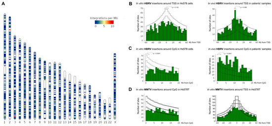 The in vitro HBRV integrations were observed to cluster with a variable density of insertions within the human genome (Figure 4A). Accordingly, we assessed the relationship of HBRV insertions proximal to genomic features by comparing our experimental data with a plot of random insertion sites within the human genome. Generally speaking, individual retroviruses tend to adopt different behaviours and cluster around specific chromatin markers. However, MMTV appears to be an exception because the integration patterns show little demonstrable preference for insertions around TSS or CpG islands. For example, gammaretroviruses tend to integrate within +/- 2 Kb TSS and CpG islands through interactions of the viral integrase with bromodomain and extraterminal proteins; whereas human immunodeficiency virus has a propensity for avoiding CpG islands while preferentially inserting into transcription units guided by the LEDGF p75 transcriptional cofactor, which directly binds the HIV preintegration complex and tethers it to open chromatin [36,66,67,68,69].