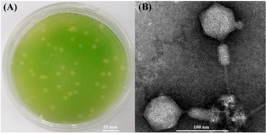(A) Plaques of cyanophage S-SZBM1 formed on the lawn of Synechococcus CB0101. (B) Transmission electron micrograph of cyanophage S-SZBM1 with non-contracted tail and contracted tail.
