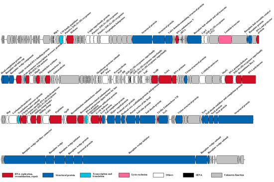 The genome map of cyanophage S-SZBM1. Genes within different functional categories are indicated by colors noted below.
