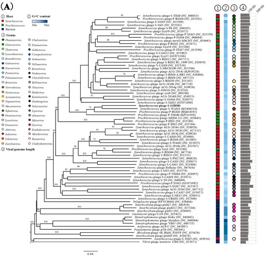 (A) Phylogenetic analysis showing the evolutionary relationship and taxonomy of cyanophage S-SZBM1. The GBDP phylogenetic tree was constructed using VICTOR based on complete amino acid profiles of compared phages. The numbers near branches of the phylogenetic tree are GBDP pseudobootstrap support values from 100 replications. The hosts, G+C content, genus cluster information, and genome size of these phages were obtained from the NCBI and the ICTV. (B) Heatmap generated by VIRIDIC incorporating intergenomic sequence similarities (right half) and alignment indicators (left half) for cyanophage S-SZBM1 and its most closely related 32 cyanophages.