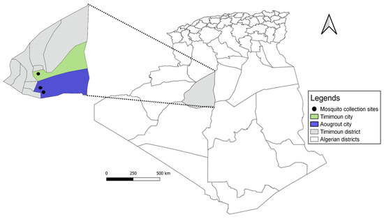In September 2017, an entomological survey was carried out in three different regions of the Timimoun district, located 1400 km southwest of Algiers, the capital city. Southwestern Algeria is characterized by a Saharan climate and its well-known oases, many of which are designated as wetlands of international importance [17]. Mosquitoes were captured using five CDC-light traps (1012 model; J. W. Hock Co., Gainesville, FL, USA) near human habitations and in animal shelters (sheep, goats, and chickens) during seven consecutive nights in three sites (Figure 1): (i) Timimoun city (29°14′20.10″ N, 0°12′30.97″ E), an urban oasis site; (ii) Aougrout village (28°41′55.62″ N, 0°20′29.57″ E), a suburban oasis site, and (iii) a sewage discharge (28°43′1.63″ N, 0°18′14.98″ E) (rural site). The two last sites are near each other and are almost 70 km away from the Timimoun city site.