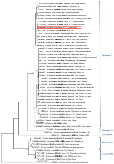 As expected, SINV-Algeria-2017-Cx. perexiguus belonged to genotype 1 that includes strains of Europe (Sweden, Finland, Germany, Norway, Russia) and Africa (Cameroon, Uganda, South Africa) that have been isolated/detected in mosquitoes, birds, and small terrestrial mammals. Genotype 1 also contains human strains accounting for outbreaks in South Africa and Northern Europe [1].
