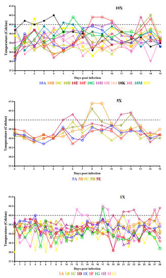 Evolution of body temperature in animals IM inoculated with either 103.6 HAD50 (panel 10X), 103.3 HAD50 (panel 5X), or 102.6 HAD50 (panel 1X) of ASFV-G-∆I177L. Data are presented as individual values (expressed as °C) for each of the inoculated animals in each of the different groups.
