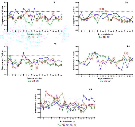 Evolution of body temperature in animals IM inoculated with ASFV-G-∆I177L during 5 consecutive passages (panels P1–P5, respectively). Data are presented as individual values (expressed as °C) for each of the inoculated animals in each of the different groups.