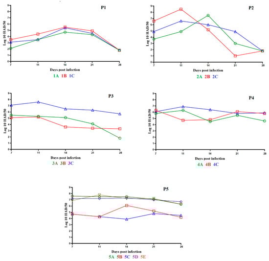 In the fifth back passage, five animals were IM inoculated with 2 mL of pooled blood samples from pigs in the fourth back passage, with titer values of 106.6 HAD50/mL. These five pigs showed no clinical signs during the observational period. Pig 5C had a transitory decreased intake of food for a four-day period (days 17 to 20 pi). As with the animals in back passage four, all animals showed normal body temperatures during the observational period, with the exception of short periods (five days for pig 5B, two days for pigs 5C and 5E, and one day for pigs 5A and 5D) during which the pigs had a minor increase in body temperature (Figure 2, panel P5). Titers of viremia had average titer values of between 106.1 and 105.6 HAD50/mL on day 7 to 28 days pi (Figure 3, panel P5).