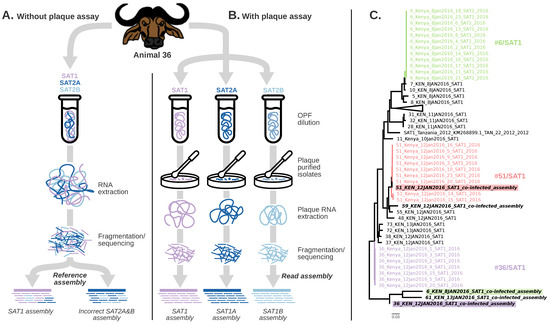 Assembly error induced by viral co-infections. (A) Describes the assembly process without and (B) with plaque purification. (C) Maximum likelihood phylogeny of the capsid protein including SAT1 sequences from co-infected samples obtained by direct NGS from the first passage of the sample, and from individual plaque-purified viral. The highlighted sequences depict an incorrect assembly of consensus SAT1 sequences obtained from first-passage co-infected samples. Short reads of related viruses resulted in a biased consensus. Therefore, these sequences have an apparent distant genetic relationship from the sequences obtained with the plaque purification assay.