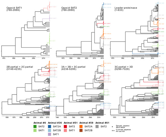 In the reconstruction of the capsid-coding segment, sequences from animal #6/SAT1 diverged earliest from the #36/SAT1 and #51/SAT1 sequences, with a most recent common ancestor estimated in 1987 (95% HPD 1971–2001; Figure 3). Animal #36/SAT1 and #51/SAT1 sequences were more closely related (TMRCA: 2001 95% HPD 1992–2009). The estimated ancestor for all sequences of #51/SAT1 was 2014 (95% HPD 2012–2015), indicating a higher within-host divergence of this virus. SAT2 capsid sequences from #36/SAT2, #51/SAT2, and #6/SAT2 were closely related, with an estimated TMRCA in 2011 (95% HPD 2008–2014). Interestingly, there were two different clusters of SAT2 viruses from animal #36. These two SAT2 viruses were denoted as #36/SAT2A and #36/SAT2B. The sequences had a recent estimated common ancestor in 2015 (95% HPD 2014–2016) based on the capsid sequences. Notably, animal #59, which was initially identified as co-infected, but from which only SAT2 was recovered from plaques, also had two different SAT2 viruses, denoted #59/SAT2A and #59/SAT2B. These viruses had a recent common ancestor estimated at 2014 (95% CI 2013–2015) based on the capsid sequences. Interestingly, one virus within the #59/SAT2A group (named #59/SAT2-plaque4) was considerably divergent (marked with an * in Figure 3) from both #59SAT2A and #59SAT2B clades. This virus had a unique phylogeny not only in the capsid-coding region, but throughout all recombination-free coding areas.