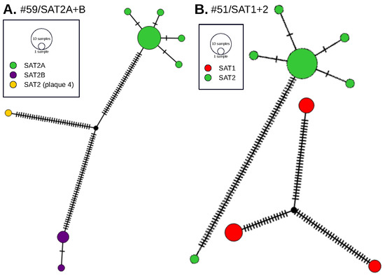 Network analysis of plaque sequences. (A) One sequence from this animal (#59/SAT2-plaque4) is a potential chimera of #59/SAT2A and #59/SAT2B. The network analysis confirms this observation by creating a network in which two genotypes originate from the same node. (B) Representative datasets were used from #51/SAT1 and #51/SAT2. Despite the divergence of the sequences, there is no apparent shared network between the SAT1 and SAT2 viruses.