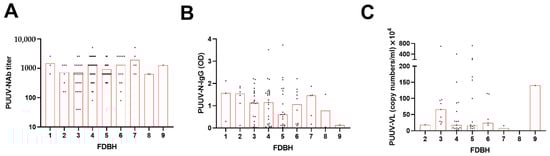 All patients displayed detectable circulating neutralizing antibodies (PUUV–NAb) and N protein-specific IgG (PUUV–N–IgG) in serum samples taken on the first day of hospitalization (Figure 1A,B). There was no evident trend between PUUV–NAb titers and fever days before hospitalization (FDBH), whereas higher N-specific IgG levels seemed to be associated with shorter FDBH. In terms of circulating viral RNA (VL), 45 out of 53 patients had detectable viral RNA in serum but without showing an obvious trend in comparison to FDBH (Figure 1C).