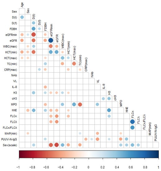 The Spearman correlation plot of the basic dataset where missing data points in variables were excluded pairwise. Variable abbreviations are D(t) = overall disease duration, D(f) = overall duration of fever, FDBH = fever days before hospitalization, eGFR = estimated glomerular filtration rate, WBC = white blood cell count, HCT = hematocrit, TC = thrombocyte count, CRP = C-reactive protein, NAb = PUUV neutralizing antibodies, VL = PUUV viral load, IL-8 = interleukin-8, H3 = histone H3, cH3 = citrullinated histone H3, MPO = myeloperoxidase, hNE = neutrophil elastase, FLCκ = free light chain κ, FLCλ = free light chain λ, MAP = mean arterial pressure, and Sev(scale) = severity scale. The maximum or minimum values during the hospitalization are indicated as min or max, respectively, and all other parameters are measured from the first day of hospitalization. Only significant correlations at p ≤ 0.05 are shown, and the size of the dots is equivalent to the significance. Note that the significance of Sevscale for eGFR and eGFRmin is redundant due to the shared parameters defining them.