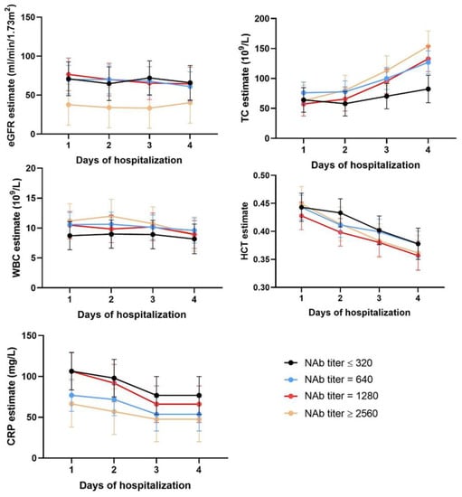 Time-series graphs showing the impact of different categories of NAb on the first day of hospitalization on the estimated glomerular filtration rate (eGFR), blood thrombocyte count (TC), white blood cell count (WBC), haematocrit (HCT), and C-reactive protein (CRP). The variables were followed over time (the first 4 days of hospitalization) and reported as mean estimates obtained from the mixed model analysis. The error bars indicate upper and lower limits of the estimates.
