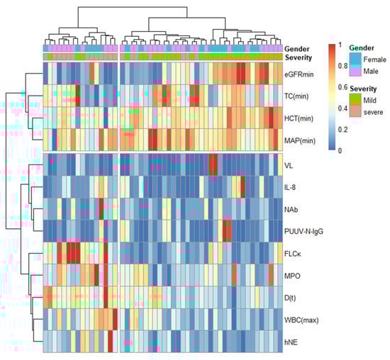 There are 116 (66% male and 34% female) hospitalized patients with acute NE in this study. The descriptive clinical and laboratory parameters are listed in Table S1. There were no fatal cases, although five patients received dialysis treatment due to acute kidney injury (AKI), the main manifestation of severe NE. Patients were admitted to hospital on average 5 days after onset of fever ranging from 1–15 days. The mean duration of illness, measured from time of onset of fever to discharge from hospital (Dt), was 11 days, ranging between 4 and 21 days. We quantified the extent of AKI by assessing estimated glomerular filtration rate (eGFR) during hospitalization. The average minimum eGFR for the hospital stay was 65.23 mL/min/1.73 m2, ranging from 4 to 128 mL/min/1.73 m2. As a marker of overall disease severity, we calculated a severity value (Sevscale) for each patient (see materials and methods for details). The average Sevscale value for the patients was 3, ranging between 0 and 8. The patients were classified into severe (Sevscale > 3) and mild (Sevscale ≤ 3) with 40 and 76 patients, respectively. Since the patient data (data with all patients was named basic dataset) included several missing values, we performed parallel statistical analyses excluding patients with missing values (scaled dataset with 49 patients, 59% male, and 41% female). In the hierarchical cluster analysis, we were exceptionally able to utilize the scaled data of 51 patients instead of 49 (60% male and 40% female) since variables in the final heatmap included fewer missing values than the variables of the whole dataset. The two added patients were males with mild disease. The results presented below are based on basic data unless stated otherwise.