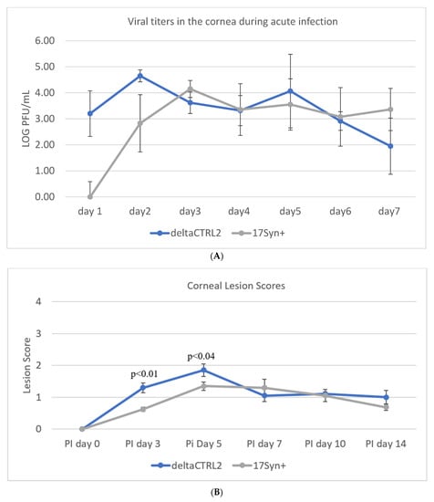 Ocular replication of wild-type 17Syn+ and ΔCTRL2 in rabbit corneas. (A) Ocular swabs were taken following infection from 1–7 dpi and plaque-forming units were calculated for both cohorts of rabbits during the acute infection. There was a significant increase in pfu/eye from the swabs of the ΔCTRL2-infected rabbits on 1–2 dpi. (B) Slit lamp examinations were performed on a separate cohort of rabbits to assess the HSV-1 lesion size and severity between the two virally infected groups. Similar to the pfu/eye, there were higher scores for rabbits infected with ΔCTRL2 on days 3–5 post-infection, indicating the lesions in those eyes were more significant in the earlier days. Statistical analyses were performed by one-way ANOVA (n = 10).