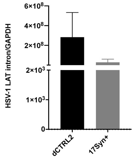 - Neumann, D.M.; Bhattacharjee, P.S.; Giordani, N.V.; Bloom, D.C.; Hill, J.M. In Vivo Changes in the Patterns of Chromatin Structure Associated with the Latent Herpes Simplex Virus Type 1 Genome in Mouse Trigeminal Ganglia Can Be Detected at Early Times after Butyrate Treatment. J. Virol. 2007, 81, 13248–13253. [Google Scholar] [CrossRef] [Green Version]