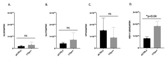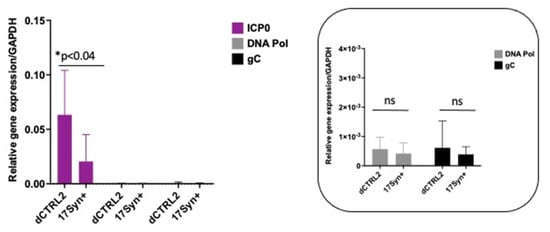 Vero cells (ATCC CCL-81) and Neuro 2A cells (ATCC CCL-131) were cultured in Dulbecco’s Modified Eagle’s Medium (DMEM) (Corning, NY, USA) supplemented with 10% fetal bovine serum (FBS) and 1% antibiotic-antimycotic solution (Gibco) in a humidified atmosphere with 5% CO2 at 37 °C and passaged at regular intervals when the cells were 75% confluent. HEK293FT cells (ThermoFisher R70007, Waltham, MA, USA) were cultured in DMEM supplemented with 10% FBS, 1% antibiotic-antimycotic solution and 2 mM L-glutamine in humidified atmosphere with 5% CO2 at 37 °C and passaged at regular intervals when the cells were 75% confluent. The HSV-1 strain, 17Syn+ (GenBank accession number NC_001806), was obtained from J. Stevens, propagated, and maintained in our lab. The recombinant HSV-1 (ΔCTRL2) was generated by the Bloom Lab and had a 135-bp deletion at the core CTRL2 insulator site in the wt 17syn+ genome, spanning nucleotides 120,500 to 120,635, as described in our previous publications [24,29]. HTS sequencing of the 17∆CTRL2 virus was performed, and the obtained data were compared to the sequence of our lab stock of 17Syn+. The results of this sequence analysis revealed no indels within the coding regions of genes, and only 1 single-nucleotide base change in UL36, which was synonymous. There were 4 additional single-nucleotide base substitutions and 1 two-nucleotide deletion that occurred in non-coding regions (mainly in reiterated regions in the repeats) [30]. Considering this sequencing data, it is unlikely that any sequence changes resulted in changes to the fitness of the ∆CTRL2 recombinant. All viruses were amplified and titrated on rabbit skin cells (CCL-68-ATCC) using Eagle’s Minimal Essential Medium (Life Technologies, Carlsbad, CA, USA) supplemented with 5% calf serum, 250 U of penicillin/mL, 250 μg of streptomycin/mL, and 292 μg of L-glutamine/mL (Life Technologies).