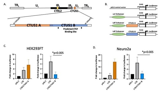 A 200 bp fragment in the Us Region of HSV-1 (upstream of Us9) had LAT-enhancer blocking activity. The decreased expression of Us9 in rabbits infected with the ΔCTRL2 recombinant suggested that the CTRL2 insulator was involved in regulating Us9 transcription either during latency and/or reactivation. CTCF insulators that have been characterized in the context of mammalian cells and transcriptional control are known to self-dimerize to form complex three-dimensional chromatin structures known as chromatin loops that orient distance-separated transcriptional elements such as enhancers and promoters into close spatial proximity for the purposes of transcriptional control [37,38]. Given that the CTRL2 insulator and Us9 are also distance separated in the HSV-1 genome, we hypothesized that there might be a second functional insulator element near the Us9 region that could potentially facilitate CTCF dimerization during latency. In fact, a putative CTCF-binding motif was previously described in the Us region of the genome [18]. To further explore this possibility, we utilized an online CTCF insulator prediction database known as CTCFBSDB 2.0 to identify putative CTCF insulators in the HSV-1 Us region near the Us9 gene. In the HSV-1 sequence spanning nucleotides 143,691–144,072, we identified a putative CTCF insulator from the database (Figure 6A-CTUS1B). To test the ability of the predicted CTCF insulator to block LAT enhancer activity, we generated reporter constructs using a commercially available pGL3-control plasmid and tested each construct for enhancer-blocking function against the LAT enhancer using standard luciferase assays in transient transfections in either HEK293 or Neuro 2A cells to account for cell-type-specific activity between the epithelial and neuronal cells (Figure 6B). The reporter constructs tested included the putative CTCF motif with ~200 bp of site-specific sequences flanking the core insulator motif cloned into a construct containing a 589 bp sequence that corresponded to the LAT enhancer of HSV-1 (LTE), as previously reported [18,19,20]. An additional construct, containing a 200 bp sequence from the Us region of HSV-1 that was not predicted to be a CTCF insulator by the CTCFBSDB 2.0 database, was also generated and served as a control plasmid (Figure 6-CTUS1A). Here, we found that, in both HEK293 and Neuro 2A cells, the CTUS1B construct was able to significantly decrease luciferase expression compared to the LAT enhancer (LTE), indicating that this site was an enhancer-blocking insulator (Figure 6C,D). These data suggest that there is a functional insulator near the Us9 region of the genome that could be important for regulating region-specific gene expression during latency.
