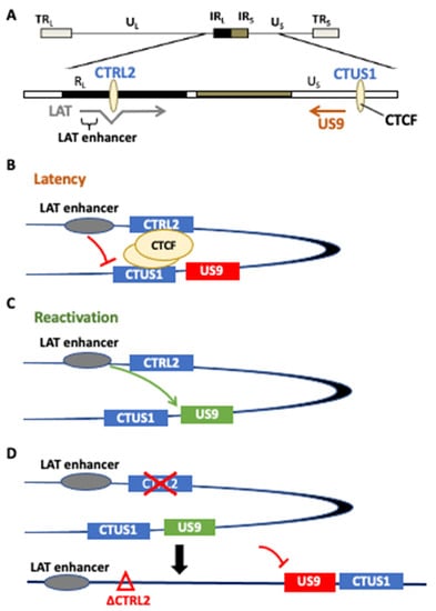 To further explore the roles of the individual CTCF insulators in HSV-1 transcriptional control, we generated a recombinant virus with the CTRL2 insulator deleted from the 17Syn+ parent virus, a well-characterized parent strain of HSV-1 known to be a virulent and reactivating strain of HSV-1 in both mice and rabbit ocular models of infection. This recombinant was extensively phenotyped in vitro and in vivo in the mouse model during the acute and latent stages of infection. Following ChIP-seq experiments in latently infected mice, we showed that H3K27me3 enrichment was attenuated in the LAT and IE gene regions, consistent with the increase in gene expression observed in the latent TG of mice, but that H3K27me3 enrichment increased at the genomic loci corresponding to the UL36 and UL37 genes, suggesting that the CTRL2 insulator might be involved in the expression of these two inner tegument genes [24]. Importantly, UL36 and UL37 are essential for efficient capsid envelopment and fusion for the release of infectious particles and are involved in larger protein complexes, and are together involved in the axonal targeting of viral spread during reactivation. We hypothesized that the CTRL2 insulator may also be involved in efficient reactivation from latency through the regulation of genes involved in axonal transport. While there was a slight decrease in UL36 and UL37 expression in ΔCTRL2-infected rabbits, these decreases were not significant, thus suggesting that there may be other co-factors involved in reducing reactivation in the absence of the CTRL2 insulator. To further support this, we quantitated a significant decrease in the expression of Us9 in rabbits infected with the mutant virus. This finding was exciting. >HSV Us9 is a type II membrane protein that has been shown to be required for anterograde transport in neurons, and previous reports have shown that Us9 mutants display a reduced axonal transport phenotype [27,28]. Consistent with these previous reports, in the current study, we showed that rabbits infected with the CTRL2 deletion virus had a significantly attenuated reactivation phenotype compared to the wt-infected animals. It is important to point out that, in the current study, we measured clinical reactivation as quantitated by the presence of infectious virus recovered in the eyes of rabbits following the induction of reactivation. More extensive studies that quantitate the initiation of reactivation or molecular reactivation in the neuron are currently underway, and will be the subject of an additional manuscript in the future. Nonetheless, the presented data suggest that the CTRL2 insulator plays a role in suppressing Us9 expression during latency, and perhaps allows Us9 expression during reactivation episodes in neurons. Considering that the Us9 region of the genome is distance separated from the CTRL2 insulator, it is intriguing to speculate that these two regions may be brought together into close spatial proximity by the dimerization of CTCF insulators. CTCF insulators also establish and maintain higher-order chromatin structures, known as chromatin loops [44]. In eukaryotic cells, genomes are folded into spatial domains in three-dimensional forms and organized into higher-order chromatin structures that are subdivided epigenomic compartments ranging in size from 6 kb to more than 5 Mb. These compartments are known as topologically associated domains (TADs) and function as interaction hubs where regulatory elements interact with genes to activate or silence transcription [45,46]. TADs are partitioned into transcriptional domains by the self-dimerization of complementary CTCF insulators [44], and more recent evidence has shown that these DNA loops are anchored by protein complexes known as cohesin [44]. We have recently shown that a cohesin protein is enriched near the CTRL2 insulator, further supporting that this insulator can form a chromatin loop if in the right spatial orientation to self-dimerize with additional CTCF insulators [29]. We hypothesized that this insulator might be interacting with another insulator near the Us9 region of HSV-1 to establish a chromatin organization that would support the positioning the LAT enhancer in close proximity to Us9. To support this, we identified a CTCF-binding site in the Us region of HSV-1 that had enhancer-blocking ability in a cell-type-independent manner that was occupied by CTCF during latency [18]. Therefore, we propose the following model as a potential mechanism for HSV-1 reactivation from neurons (Figure 7). During latency, CTCF insulators CTRL2 and CTUS1 self-dimerize to position the LAT enhancer in spatial proximity to the Us9 gene. During latency, these insulators are occupied by the CTCF protein, acting both as an enhancer blocker to the LAT enhancer and preventing the expression of Us9 (Figure 7B) [18,19]. However, upon reactivation, CTCF protein is evicted, thereby allowing for the LAT enhancer to activate the Us9 promoter (Figure 7C). In the absence of the CTRL2 insulator, the spatial orientation between the LAT and Us9 regions is disrupted, inhibiting efficient reactivation through a mechanism involving axonal transport (Figure 7D). Further studies that will map these spatial interactions in vivo are currently underway.
