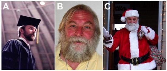 Photographs of Randall Cohrs during his career. (A). Graduation ceremony at Southern Illinois University in 1985. (B). Taking a break at a virology meeting in 2008. (C). Randy dressed as Santa Claus for a favorite children’s event in Lakewood, Colorado, in 2013.